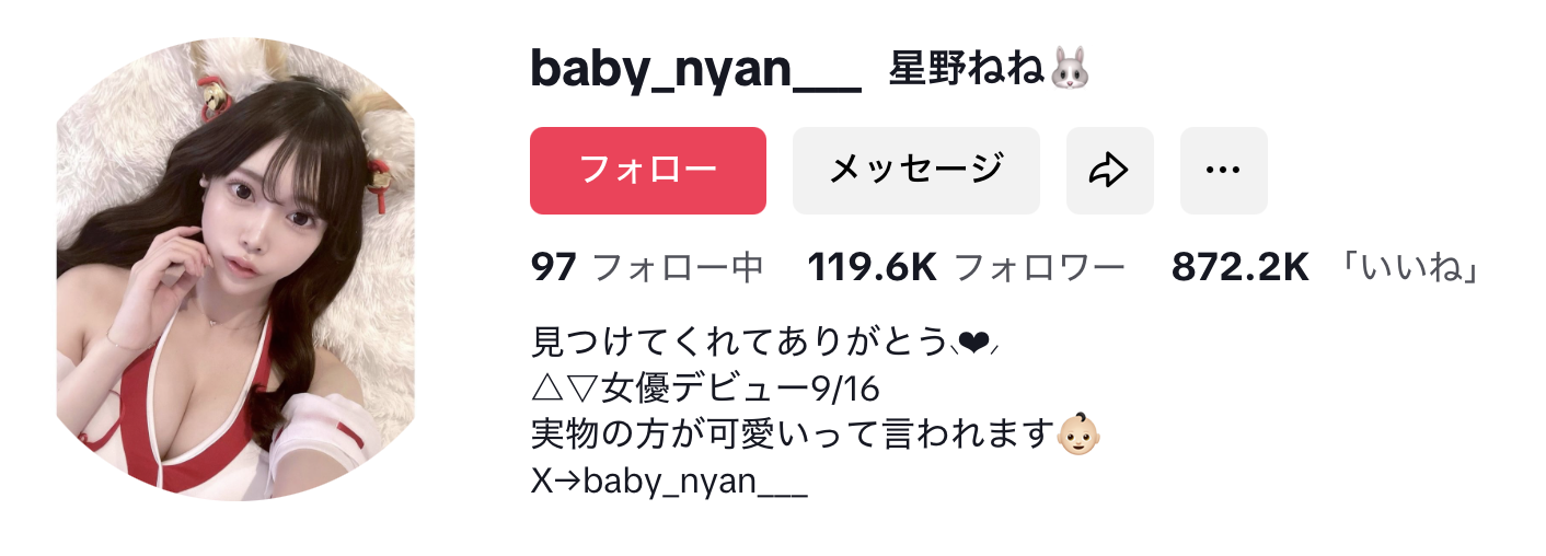因为怕你不信,所以片商附上了她的Tiktok帐号(https://www.tiktok.com/@baby_nyan___),确实是个接近12万追蹤的网红,而且还很贴心地附上了艺名ー没错,她叫做星野ねね(星野宁宁),虽然透过这个艺名你还可以找到她的X和IG,虽然追蹤没有TIktok多,不过从上传的自拍照和短影音来看她就是个标準的网红脸,而且,身材还不错呢: