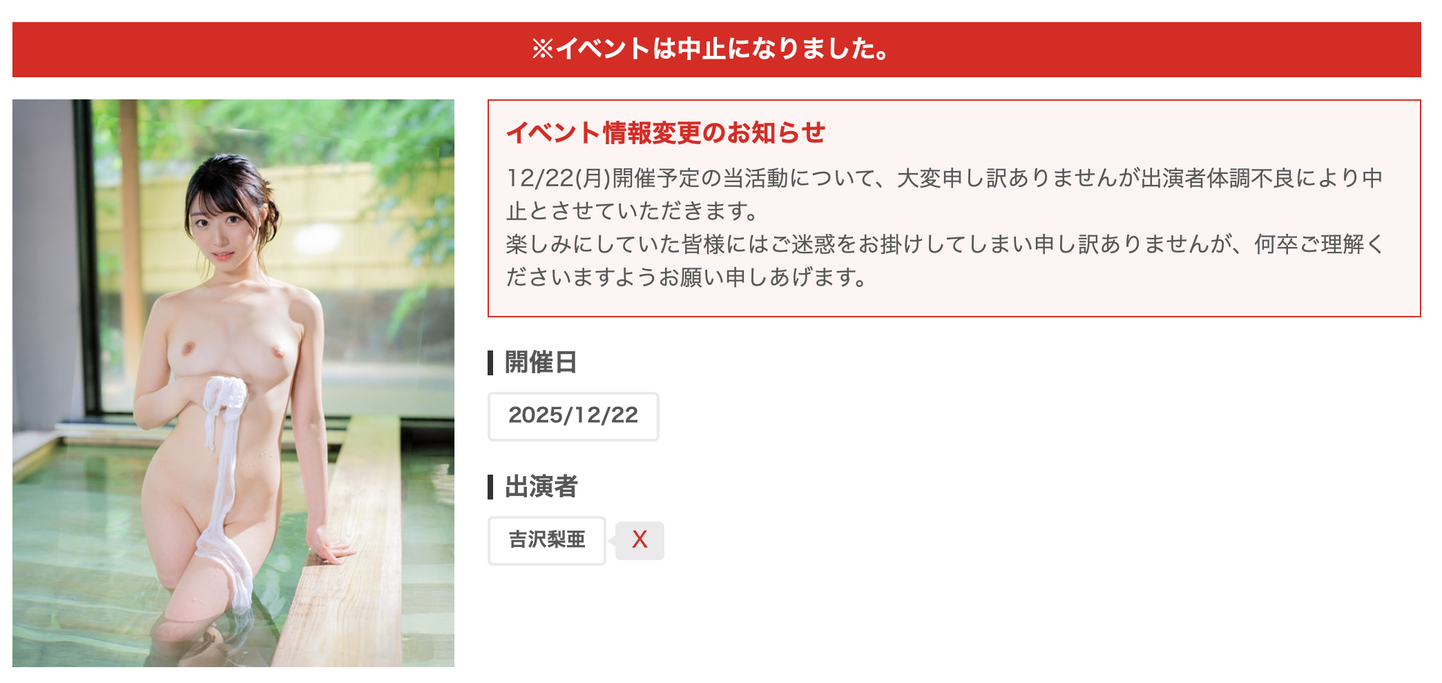 虽然女优突然消失从来不是新鲜事,但吉沢梨亜(吉泽梨亚)真的出人意料:大家都知道2025年的最后两个月正是Faleno集团大张旗鼓举办大感谢祭见面会活动的时候,吉沢梨亜(吉泽梨亚)虽然不是开头也不是压轴出场的女优,不过她可是Faleno集团的宣传大使,除了在10月份担任一日店长的活动外,在这次的大感谢祭活动中她也扮演吃重的角色ー片商不是笨蛋,会把宣传大使的任务交给吉沢梨亜(吉泽梨亚)一定是因为她有人气也够稳定、不会随便出乱子,但偏偏不出意外的话就出意外了,吉沢梨亜(吉泽梨亚)说没了就没了:
